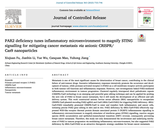 公司江育虹副教授长期从事PAR2受体对疾病调控的作用机制研究,率先利用CRISPR/Cas9基因编辑系统,同时借助纳米技术,敲除肿瘤炎症环境的PAR2基因,以探讨PAR2对肿瘤调控的新作用机制。研究发现敲除PAR2后抑制肿瘤炎症微环境中NLRP3炎症小体/IL-1β等通路,进而放大干扰素基因刺激因子STING信号转导,促进肿瘤免疫,最终阻止肿瘤转移。近日,该研究成果发表在药学TOP期刊Journal of Controlled Release (IF=10.8)上,题为“PAR2 deficiency tunes inflammatory microenvironment to magnify STING signalling for mitigating cancer metastasis via anionic CRISPR/Cas9 nanoparticles”。