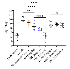 该工作发现了体内外抗菌活性和动物体内药代动力学性质均明显优于对照药G0775的候选化合物162,有望在对抗革兰氏阴性菌耐药性危机中发挥重要作用。