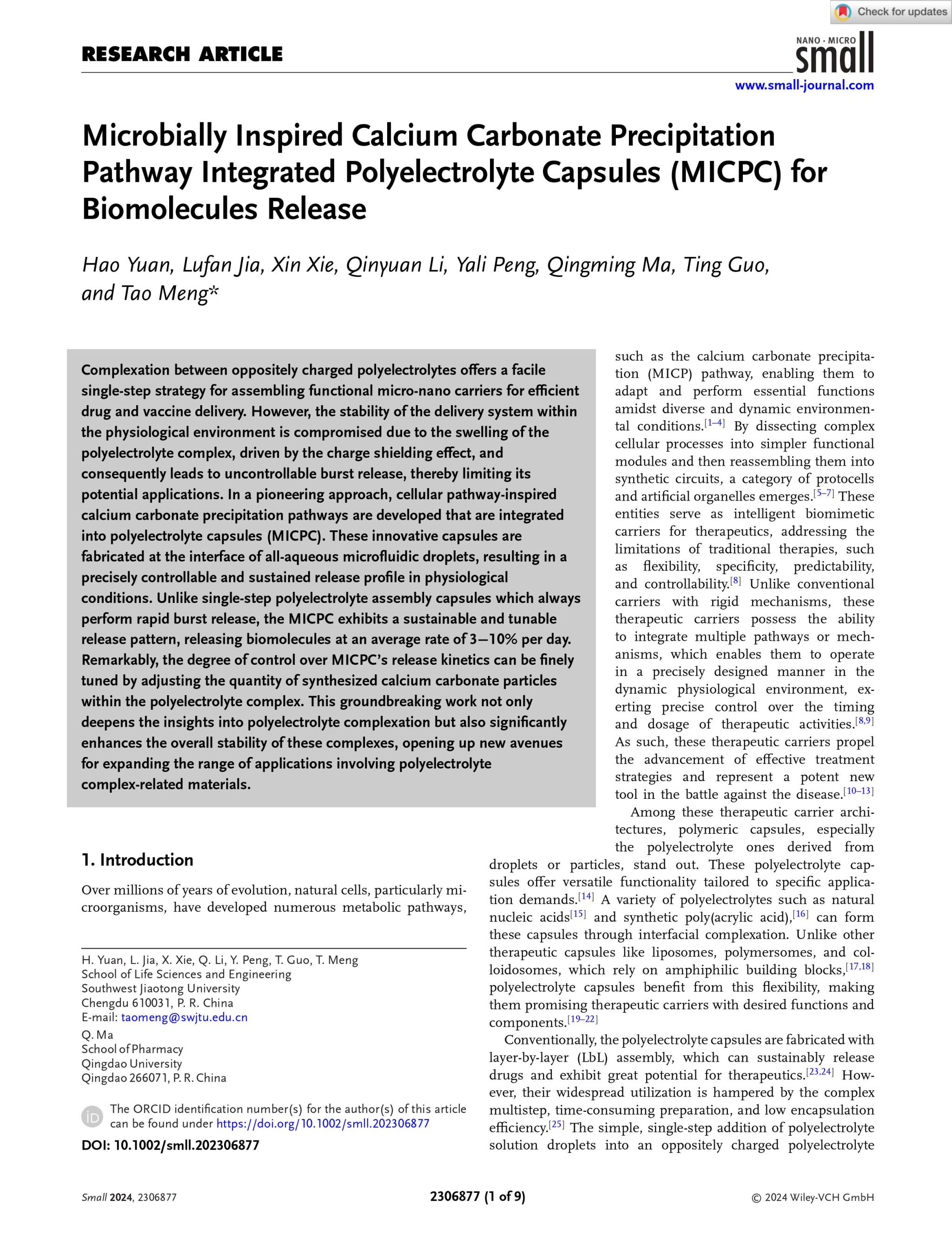 近日,国际微纳生物领域权威期刊《Small》(影响因子13.3)报道了公司“微纳生物技术”创新团队孟涛教授的研究成果“Microbially Inspired Calcium Carbonate Precipitation Pathway Integrated Polyelectrolyte Capsules (MICPC) for Biomolecules Release”中文译名:“受微生物启发的整合碳酸钙颗粒合成通路的聚电解质微囊(MICPC)用于缓释生物分子”(DOI: 10.1002/smll.202306877)。论文第一作者为365英国上市公司苑昊讲师,通讯作者为孟涛教授,365英国上市公司为第一署名单位。