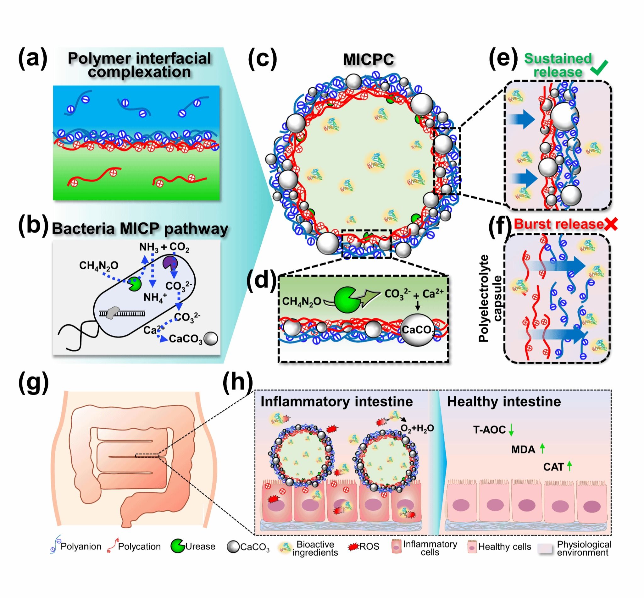 图1 受尿素分解细菌启发,构建仿生矿化的聚电解质微囊MICPC(缓释)及其与普通聚电解质微囊(突释)在生理环境中释放行为对比,且此MICPC可用于治疗肠道炎症疾病