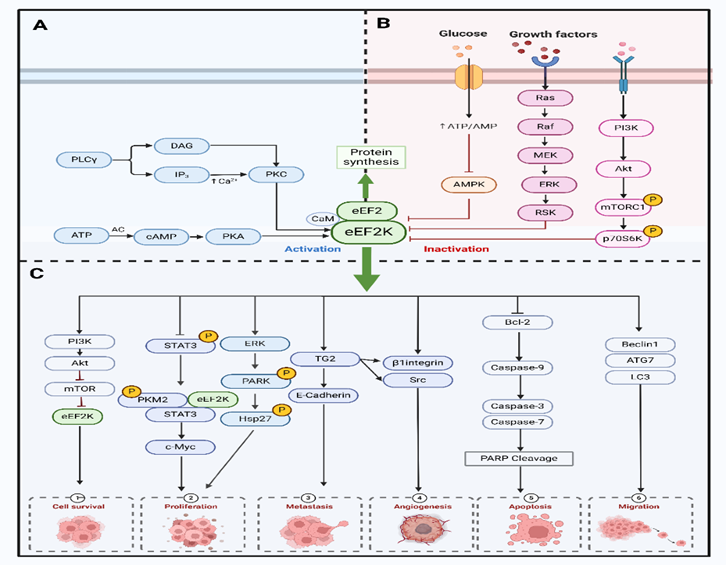作者也对eEF2K在癌症中的关键作用途径进行了总结。高度调控的蛋白激酶 eEF2K几乎完全依赖于 Ca2+/钙调蛋白(CaM)。在 Ca2+ /CaM存在的情况下,eEF2K在多个位点进行自身磷酸化,以获得最大活性。Akt/GSK3/eEF2K 信号通路通过磷酸化 Ser392 来调节 eEF2K。AMPK还能直接磷酸化 eEF2,通过多位点磷酸化,AMPK 触发 eEF2K 激活。在体外,eEF2K被 AMPK在 Ser398 处磷酸化,这被认为是 eEF2K 激活的原因。此外,eEF2K还是MAPK和PI3K通路下游的一个关键汇合点。作为 PKC 的下游蛋白被激活。mTORC1由生长因子、激素或氨基酸激活,是细胞营养或能量状况的重要传感器。eEF2K 位于 mTOR 的下游,mTORC1激活后,eEF2K在 Ser70、Ser78、Ser359、Ser392、Ser396 和 Ser470 处磷酸化,导致 eEF2K 失活,并阻止 eEF2 的磷酸化,从而导致 eEF2 水平升高并诱导蛋白质合成。FOXM1 是第一个驱动eEF2K 表达的转录因子。eEF2K mRNA 的启动子包含几个结合位点,FOXM1与这些位点直接结合,转录调控eEF2K基因的表达。NF-κB的激活会抑制 eEF2K 的转录,导致 eEF2K 蛋白水平下降。
