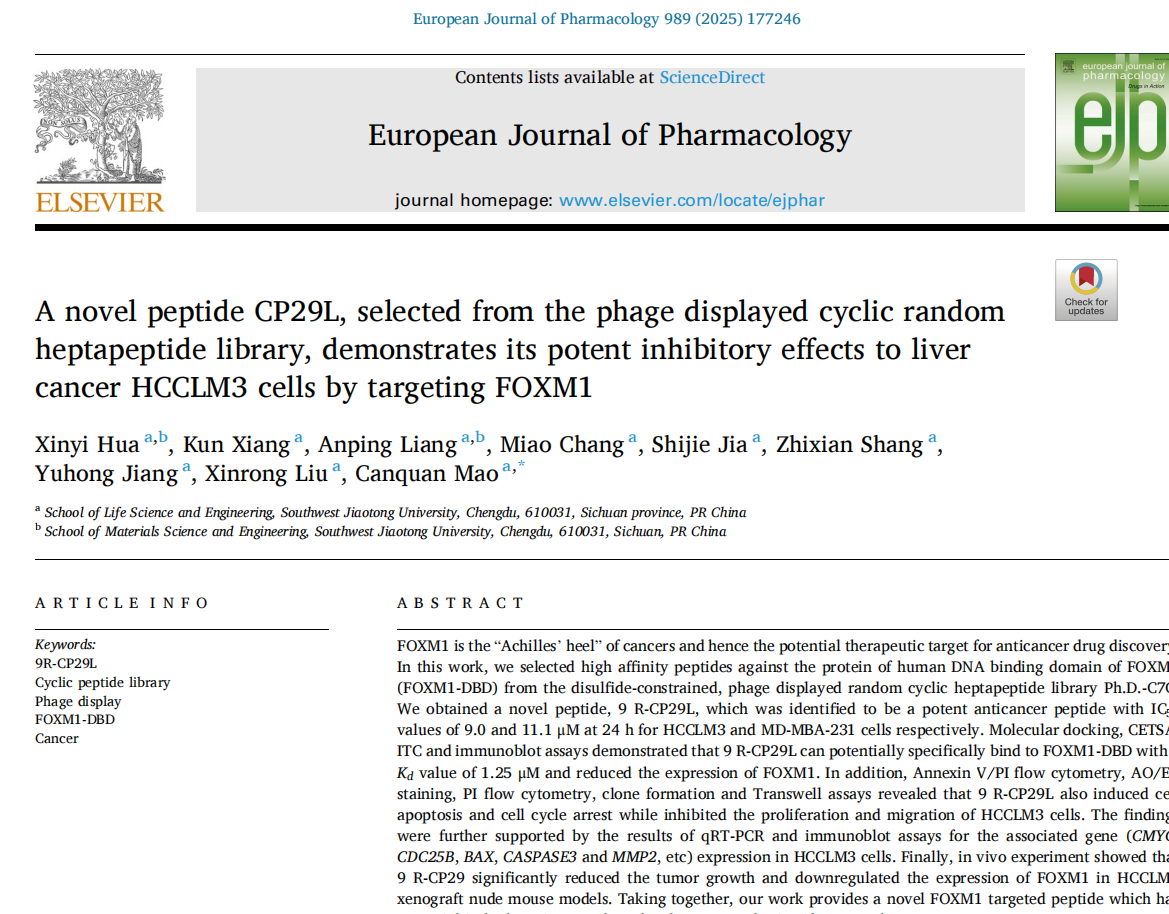 近期,欧洲药理学杂志《European Journal of Pharmacology》(JCR,Q1区)杂志正式发表了365英国上市公司“分子靶向药物药理实验室” 题为“A novel peptide CP29L, selected from the phage displayed cyclic random heptapeptide library, demonstrates its potent inhibitory effects to liver cancer HCCLM3 cells by targeting FOXM1” 的研究成果。论文通讯作者为茆灿泉教授,2021级博士研究生花欣怡、2019级硕士研究生项坤为工作主要完成者,365英国上市公司为唯一署名单位和通讯作者单位。