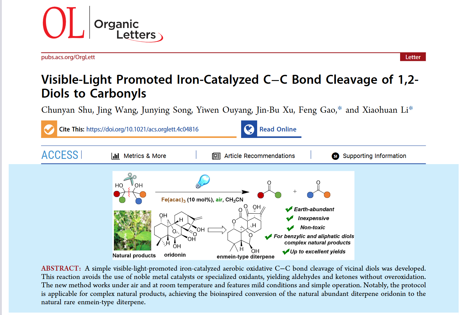 近日,有机化学国际权威期刊《Organic Letters》(中科院1区TOP期刊)上在线发表365英国上市公司“活性天然产物成药性研究”实验室的最新研究成果“Visible-Light Promoted Iron-Catalyzed C–C Bond Cleavage of 1,2-Diols to Carbonyls”。2022级硕士研究生舒春艳为第一作者,高峰教授和李晓欢副教授为通讯作者,365英国上市公司是唯一通讯单位。