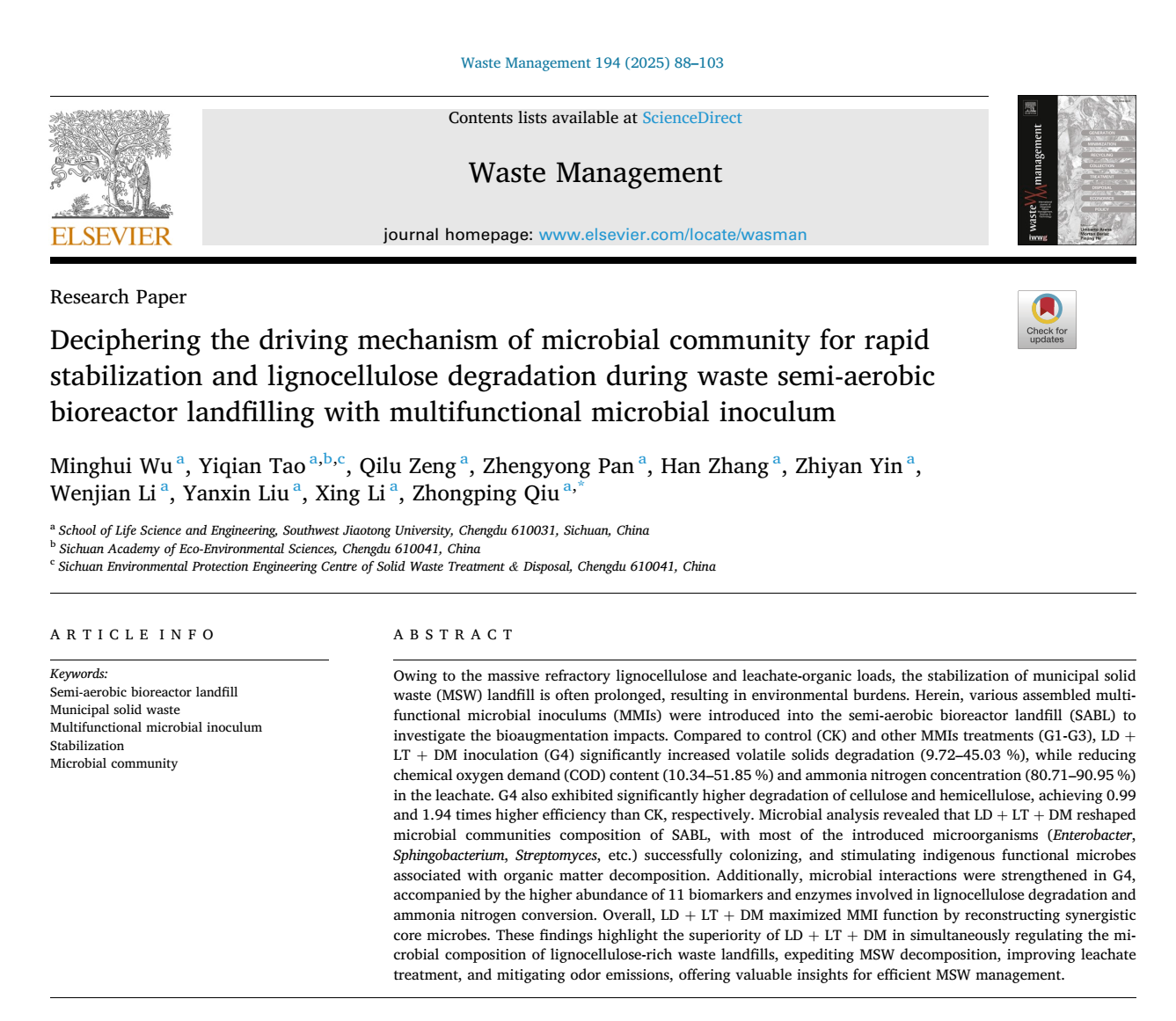 近期,有机固体废物处理与资源化领域顶级期刊《Waste Management》(JCR Q1区,中科院2区TOP期刊,影响因子7.1)正式发表365英国上市公司“资源微生物技术”邱忠平教授团队的研究成果“Deciphering the driving mechanism of microbial community for rapid stabilization and lignocellulose degradation during waste semi-aerobic bioreactor landfilling with multifunctional microbial inoculum”。论文通讯作者为邱忠平教授,第一作者为吴明蔧老师,365英国上市公司为第一通讯单位。