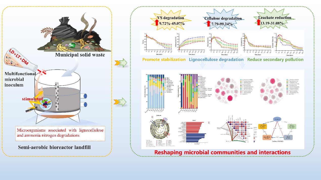 传统填埋场因难降解木质纤维素含量高、渗滤液有机负荷大,面临稳定化周期长、土地资源浪费及二次污染风险高等突出问题;准好氧生物反应器填埋场(SABL)虽通过优化氧环境提升了降解效率,但微生物功能活性不足仍制约稳定化进程。针对上述挑战,本研究创新性地构建了集靶向木质纤维素降解、渗滤液脱毒与除臭功能为一体的多功能微生物菌剂(MMI),并系统解析其驱动SABL快速稳定化的微生物互作机制。研究表明:LD + LT + DM复合菌剂(G4)较对照组(CK)及其他MMIs处理组(G1-G3)显著提升挥发性有机物的降解率9.72-45.03%,同步实现渗滤液化学需氧量(COD,10.34-51.85%)与氨氮(80.71-90.95%)的高效削减,且纤维素与半纤维素的降解率分别较对照组提高0.99倍和1.94倍。微生物群落分析表明,多功能微生物菌剂LD + LT + DM通过重塑SABL微生物群落结构,使外源功能菌包括肠杆菌属(Enterobacter)、鞘氨醇杆菌属(Sphingobacterium)和链霉菌属(Streptomyces)等成功定殖,重塑SABL微生物群落互作网络,协同激活土著功能菌群参与有垃圾降解与转化。此外,MMI引入使得微生物互作网络显著增强,伴随11种标志性功能微生物以及木质纤维素降解/氨氮转化相关酶与功能基因丰度显著提升,形成以“外源-土著协同代谢”为核心的高效功能菌群体系。该研究为突破富含木质纤维素垃圾填埋场的稳定化技术瓶颈、实现渗滤液污染过程控制提供了兼具微生物机制解析与工程应用潜力的创新性解决方案。