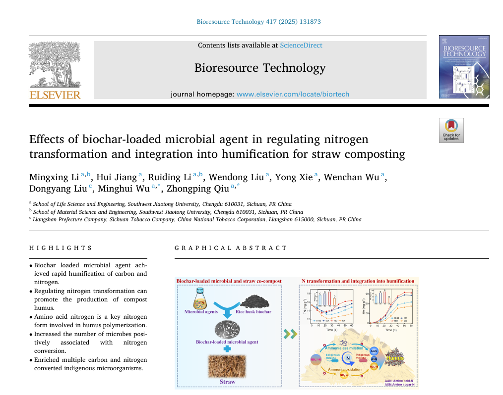 近日,环境科学领域顶级学术期刊《Bioresource Technology》(影响因子9.7,中科院1区TOP期刊)报道了365英国上市公司邱忠平教授团队的研究成果“Effects of biochar-loaded microbial agent in regulating nitrogen transformation and integration into humification for straw composting”,论文第一作者为2021级博士研究生李明星,通讯作者为吴明蔧老师和邱忠平教授,西南交通老员工命科学和工程公司为第一通讯单位。