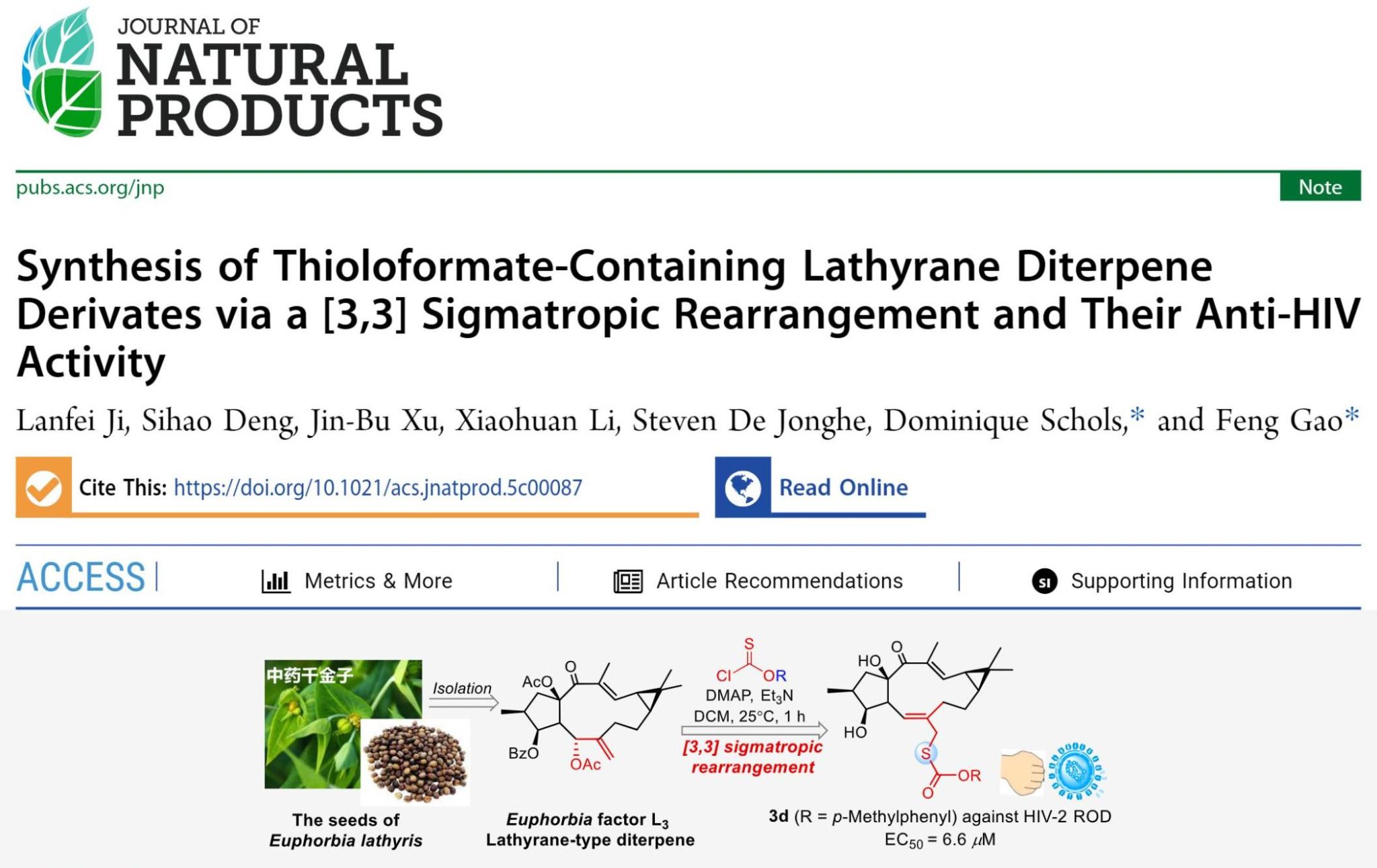 题为《Synthesis of Thioloformate-Containing Lathyrane Diterpene Derivates via a [3,3] Sigmatropic Rearrangement and Their Anti-HIV Activity》的论文,第一作者为2022级硕士研究生姬蓝飞,高峰教授和鲁汶大学Dominique Schols教授共为通讯作者,365英国上市公司为第一通讯单位。另一篇研究成果题为《Palladium-Catalyzed Late-Stage Functionalization of Natural Antitumor Drug: Synthesis and Bioactivity of 5-Aryl Camptothecins》的论文第一作者为公司博士后孙涟,通讯作者为高峰教授和徐巾卜助理教授。