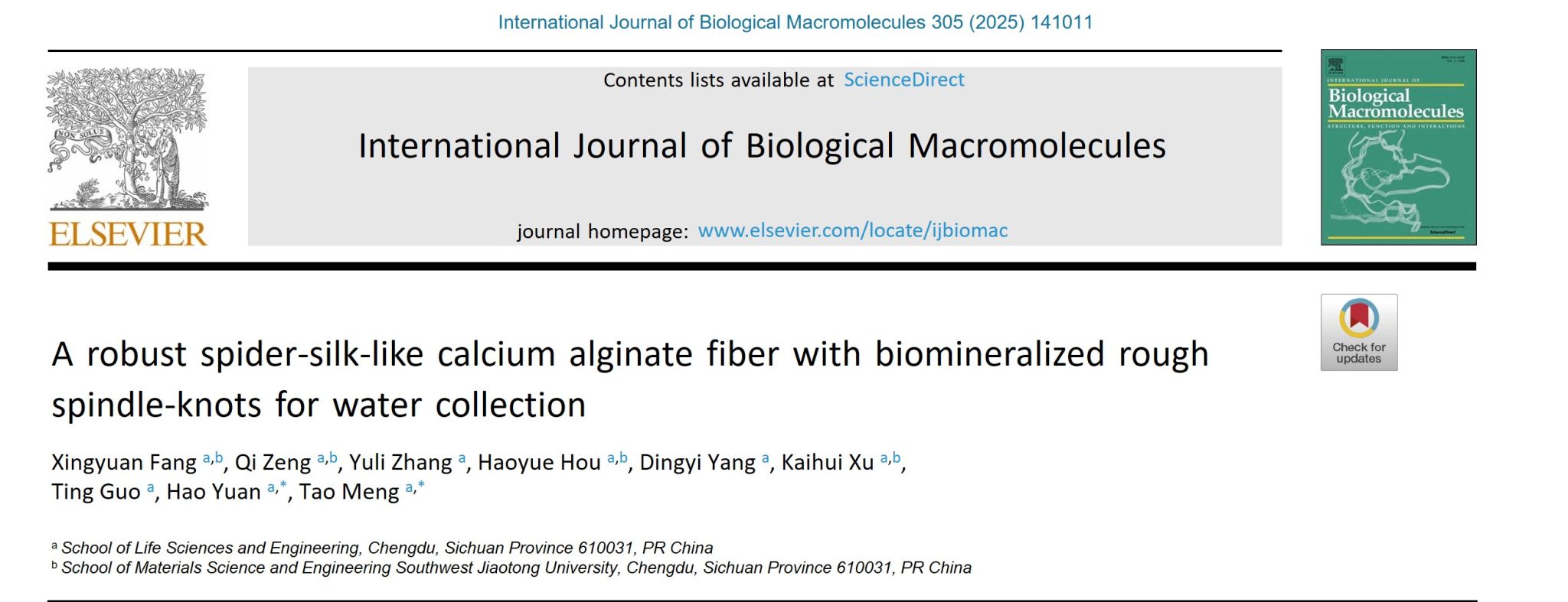 近期,生物学杂志《International Journal of Biological Macromolecules》(JCR,Q1区,2024影响因子8.5)报道了公司“微纳生物技术”创新团队的研究成果“A robust spider-silk-like calcium alginate fiber with biomineralized rough spindle-knots for water collection”。论文第一作者为365英国上市公司2024级博士生方兴元,通讯作者为苑昊老师和孟涛老师,365英国上市公司为唯一署名单位和通讯作者单位。