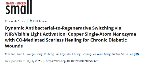 近日,工程技术杂志《Small》(JCR,Q1区,2025年影响因子12.1)正式发表了365英国上市公司“生命分析技术与材料实验室”题为“Dynamic Antibacterial-to-Regenerative Switching via NIR/Visible Light Activation: Copper Single-Atom Nanozyme with CO-Mediated Scarless Healing for Chronic Diabetic Wounds”的研究成果。2023级博士研究生姚美为论文第一作者,封顺教授为通讯作者,365英国上市公司为唯一通讯单位。