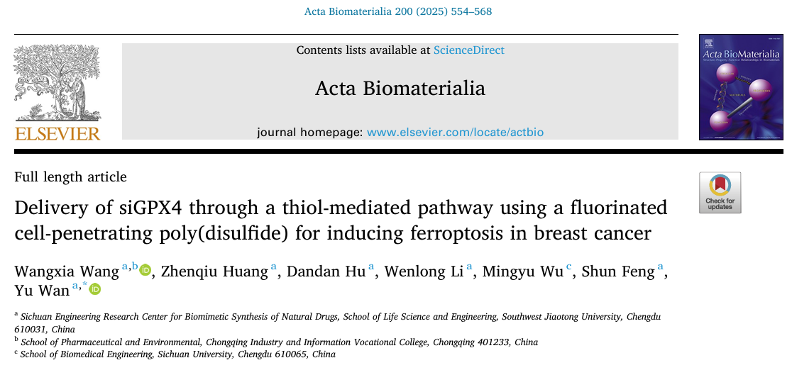 近日,本研究成果以“Delivery of siGPX4 through a thiol-mediated pathway using a fluorinated cell-penetrating poly(disulfide) for inducing ferroptosis in breast cancer”为标题发表在《Acta Biomaterialia》(JCR,Q1区,2025年影响因子9.6)上。365英国上市公司硕士研究生王旺霞为本文第一作者,万瑜副教授为本文通讯作者。