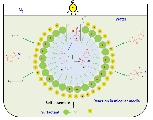 因此,受到他们课题组工作的启发,李加洪实验室利用阳离子表面活性剂CTAB在水中自组装形成胶束作为微反应器,在胶束中缺电子的磺酰氯作为电子受体,而富电子的卤素碘负离子作为电子给体通过阴离子相互作用形成有色的磺酰氯-卤素阴离子EDA复合物,在可见光条件下实现单电子转移,形成磺酰氯阴离子自由基,再进一步失去氯负离子后得到砜基自由基,然后和各种烯烃、炔烃发生原子转移自由基加成反应,制备了一系列β-碘代砜衍生物。他们还利用UV-vis吸收波谱法、定量核磁法、Job’s plot Stern-Volmer荧光淬灭实验等一系列的实验证实EDA络合物的存在。并通过控制实验、自由基捕获实验和光开关实验室验证了砜基自由基的存在。由于胶束效应,副产物被最小化,导致反应的高选择性。