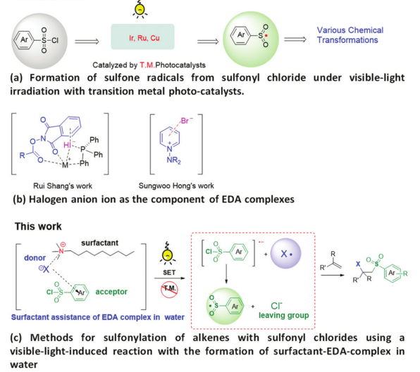 另一方面在有机合成中磺酰氯是获得砜基结构单元最常见试剂之一,然而在可见光条件下磺酰氯的裂解往往需要光催化剂特别是过渡金属催化剂(如IrRuCu等)的催化作用才能形成砜基自由基(1a),并且这些方法都需要在有机溶剂中进行。这使得这些方法不仅不经济且不环保。因此,如何在室温条件下在绿色溶剂水中不用任何光催化剂就实现磺酰氯的裂解形成砜基自由基在绿色合成上具有重要的研究意义。最近利用形成电子供体-受体(EDA)络合物策略可以在无催化条件下实现可见光介导的有机反应。特别是卤素负离子已经有报道作为EDA复合物的电子给体,如尚睿课题组和Hong课题组的工作 (1b)