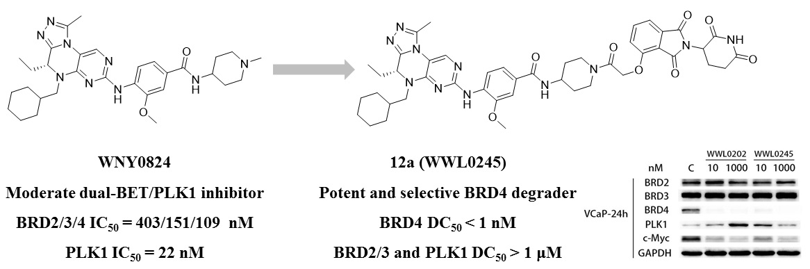 该工作通过一个温和的多靶点抑制剂WNY0824开发出了一个高降解活性、高选择性的BRD4-PROTAC分子WWL0245,在BETi敏感的肿瘤细胞系中展现出优异的抗增殖活性,可有效诱导AR-阳性前列腺癌细胞系中BRD4的降解,半数降解浓度(DC50)达到pM水平,最大降解程度(Dmax)>99%。此外,WWL0245诱导细胞周期在G0/G1期停滞以及诱导AR-阳性前列腺癌细胞凋亡,降低AR、PSA和c-Myc的蛋白水平以及抑制AR调节基因的转录。WWL0245有望被进一步开发成为新型抗肿瘤候选药物,亦可作为良好的工具分子用于探索BRD4的生理功能。