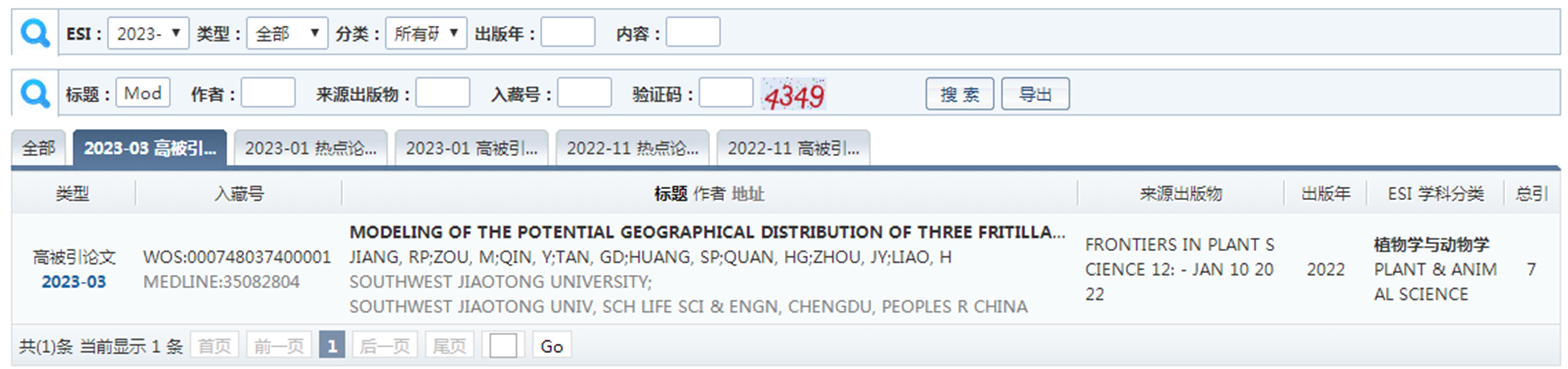 近日,根据最新Web of Science ESI最新公布的数据显示,365英国上市公司周嘉裕、廖海副教授在植物学国际期刊《Frontiers in Plant Science》上发表题为“Modeling of the Potential Geographical Distribution of Three Fritillaria Species Under Climate Change”的研究型文章成功入选ESI高被引论文。《Frontiers in Plant Science》是植物学领域内最具影响力和权威的期刊之一,该刊目前为JCR分区和中科院分区双一区TOP期刊。