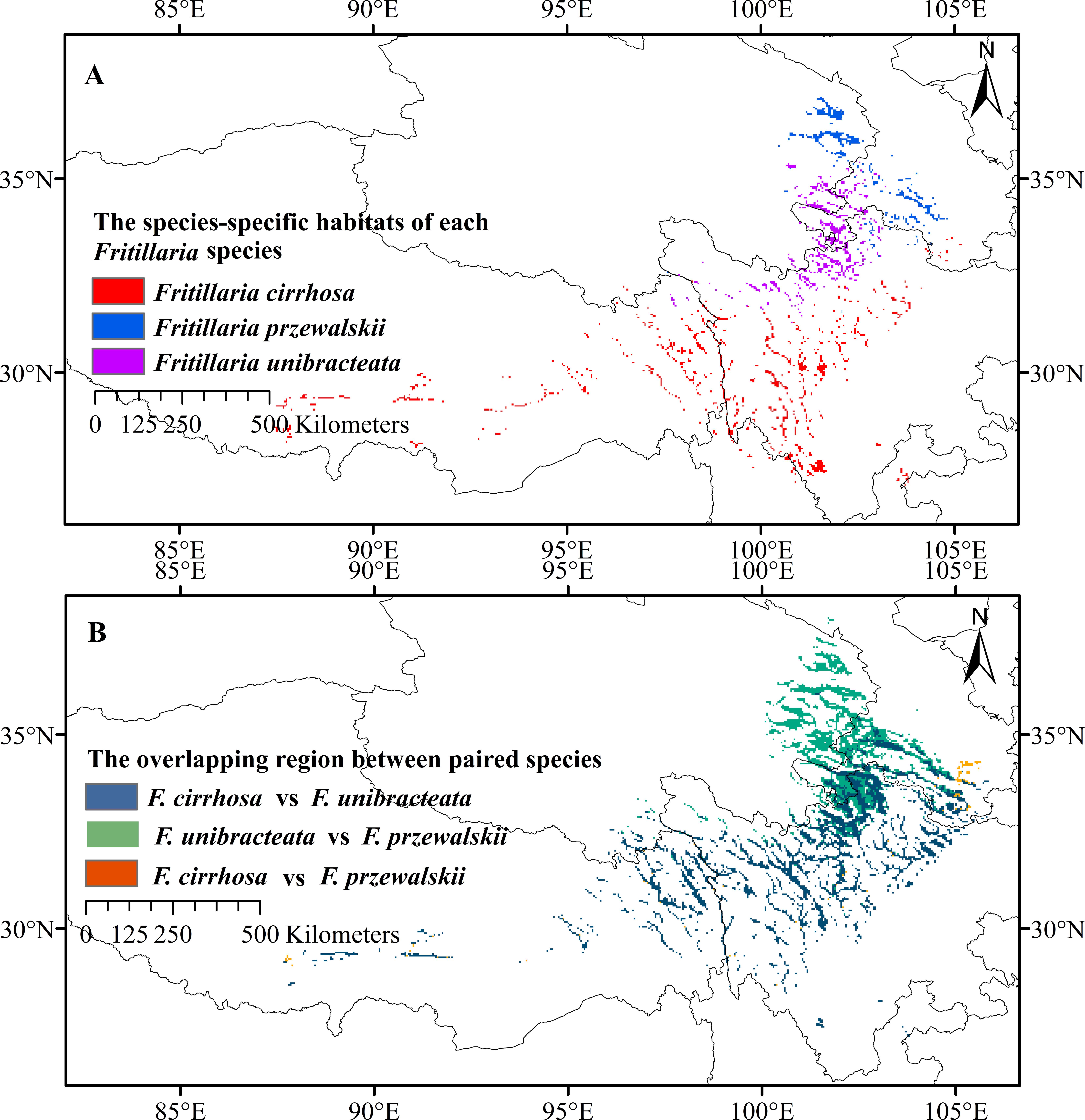 论文利用人工智能技术对川贝母的3种基原植物——暗紫贝母、卷叶贝母、甘肃贝母等开展适生区分析,结果发现年降水与海拔是影响川贝母分布与生长的主效生态因子,当前适生区主要集中在四川、青海、西藏等地区,并且预测在未来环境模式下川贝母会逐渐向高纬度与高海拔迁移。同时研究还发现,以上3种川贝母基原植物存在最高的生态位重叠,并计算出3种川贝母的专属性适生区,这为将来川贝母种植区划提供了重要的技术支撑。