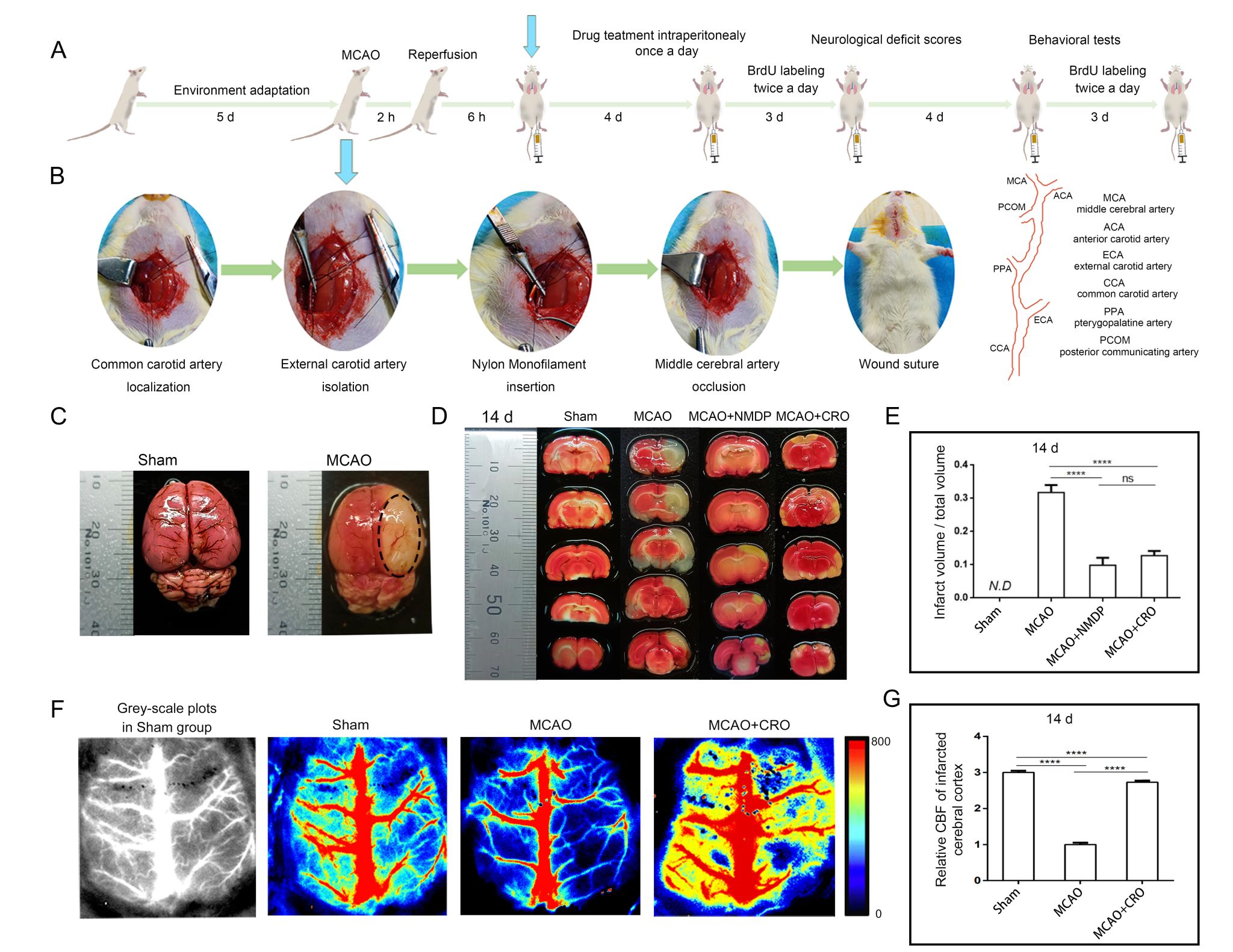 其次,该团队采用体内大鼠缺血性脑卒中动物模型,进行藏花酸治疗,通过神经缺陷评分、mNSS综合评分、病理学切片和脑梗死体积检测发现:藏花酸能改善缺血性脑卒中梗死体积并修复功能性行为损伤。对体内机制进行进一步探索,通过BrdU标记新生的神经干细胞和神经前体细胞,显示藏花酸能激活脑室下区(SVZ)的神经再生。进一步检测脑梗死区域的Tuj1和GFAP的表达,发现藏花酸能修复损伤的神经元和星形胶质细胞。MAP2检测结果表现藏花酸能促进神经元成熟并延长体内神经元长度促进细胞信息交流。
