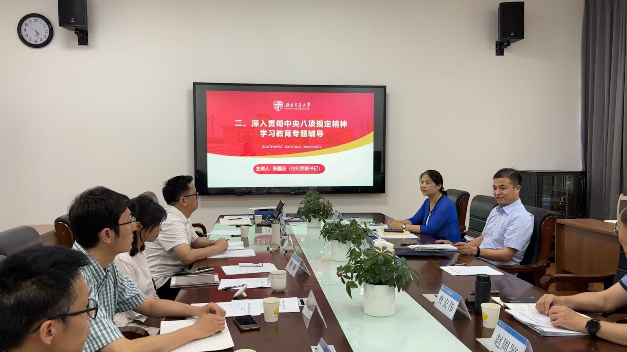 6月4日下午,公司党委理论学习中心组在犀浦校区2314会议室进行2025年第5次集体学习(扩大),邀请校纪委副书记张国正进行深入贯彻中央八项规定精神学习教育专题辅导,并开展坚定不移贯彻总体国家安全观专题学习。公司领导班子成员、党委委员、纪委委员、教工党支部书记及科职领导干部参加了学习会,会议由党委书记黄春蓉主持,党建工作联络员曹宏伟列席指导。