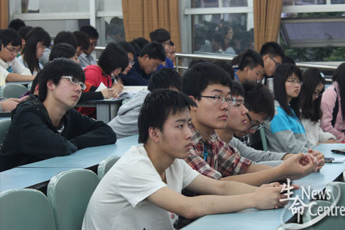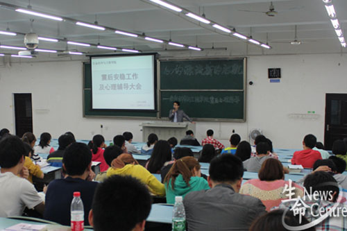 崔老师首先向大家传达了公司关于这次震后安全稳定工作的最新精神,提醒同学不要恐慌,但仍要保持警惕,提防余震,要相信政府,相信公司。第二部分,崔老师向大家详细介绍震时逃生原则和被埋之后的自救方法,并结合“5·12”汶川地震时的具体情况和公司一系列应付措施,特别指出,如发生余震,同学们应及时有序地向临时避难所疏散,并以教学区和宿舍区的示意图加以解释,切忌因惊慌而出现踩踏事故;住高层同学的同学遇震时要及时切断电源,打开门,寻找“三角区”或狭小稳固的空间,一定不要选择跳楼。