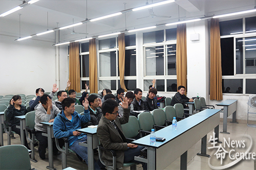 随后,支部书记曹楠普作为入党介绍人介绍发展对象情况,并对八名发展对象在校表现作出高度评价。在之后就周昆等八位发展对象能否被接受为预备党员的举手表决中,八人均全票通过。最后,曹楠普宣读大会决议,表示大会已通过接收周昆等八名同志入党的决议。