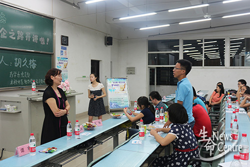 晚7:10分,谭睿副经理以幽默风趣的话语拉开了本次活动的序幕。她诙谐地将主持人形容其的“美女经理”转化为“臭美女老师”,引来同学们阵阵笑声。之后,她简要介绍了本次座谈会的目的并表示希望同学们如一颗颗星星般在未来的药企生涯中闪亮。最后,她以“今日你以交大为荣,明日交大以你为荣”结束了本次讲话。