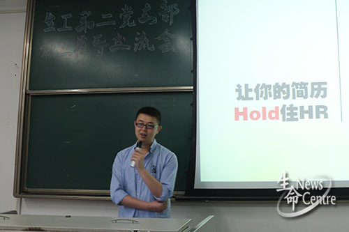 接着,张晓帆的交流主题是“让你的简历HOLD住HR”,他用自己签约经历与大家探讨简历制作、面试技巧、考官问答等一系列每位同学毕业后求职都会面临的现实问题,他诙谐幽默地多次引用自己曾面对的经典面试问题向同学们讲授回答技巧。