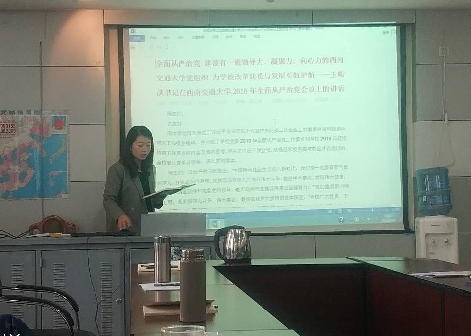 罗妍妍同志首先介绍了公司党委全面从严治党会议的主要内容,通报了公司全面从严治党相关工作及公司党政主要领导签订全面从严治党责任书等情况。随后,她带领与会人员进行了集中学习。她向与会人员解读了公司党委副书记、纪委书记张学龙同志的会议报告《牢记使命、忠诚事业、一刻不停歇地推动全面从严治党向纵深发展》,重点学习了公司党委书记王顺洪同志的讲话《全面从严治党,建设有一流领导力、凝聚力、向心力的365英国上市公司党组织,为公司改革建设预发展引航护航》,并简要介绍了公司党委2018全面从严治党工作要点和2018纪检监察工作要点。