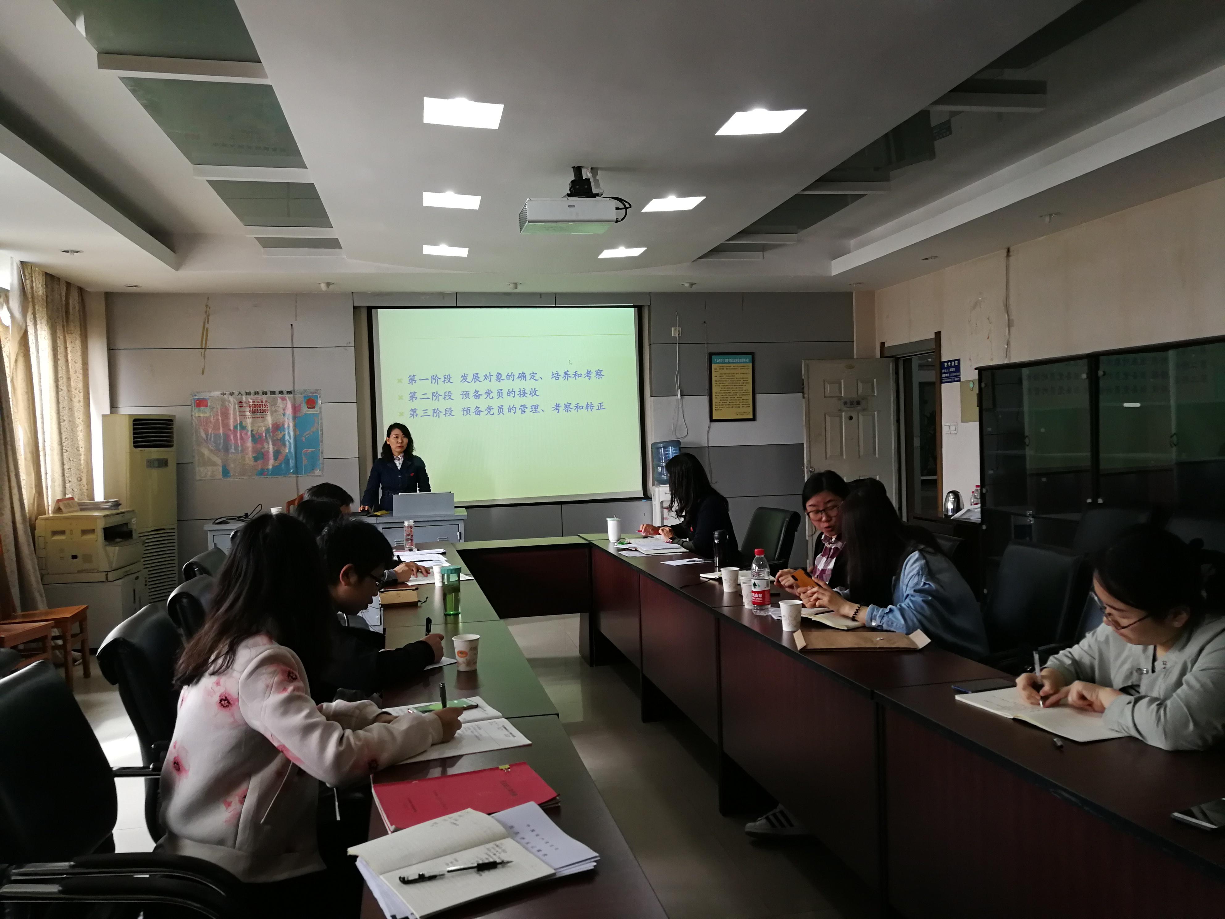随后,党委委员、党务秘书贺妍同志为全体支部书记进行了基层党务工作培训。她主要从组织发展工作流程、党员入党材料填写规范、《党支部工作手册》填写注意事项等几个方面进行了生动讲解和培训。接下来,各党支部书记就培训内容和日常工作中出现的问题及难点进行了交流。