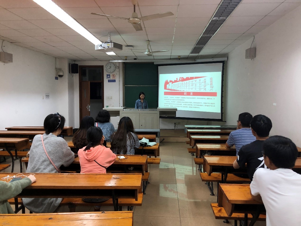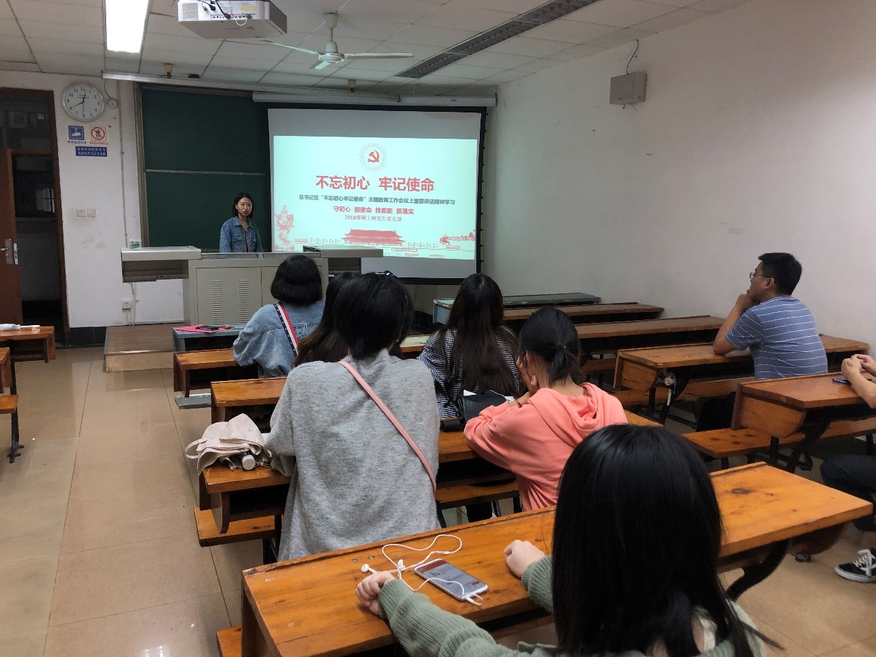 365英国上市公司2018级硕士研究生党支部于9月4日晚在逸夫馆4304B教室联合开展了以“认真学习习近平总书记在“不忘初心、牢记使命”主题教育工作会议、中央政治局第十五次集体学习上发表的重要讲话精神”为主题的党日活动。活动由2018级党支部书记王珏同志主持,支部的党员和积极分子都参加了活动。