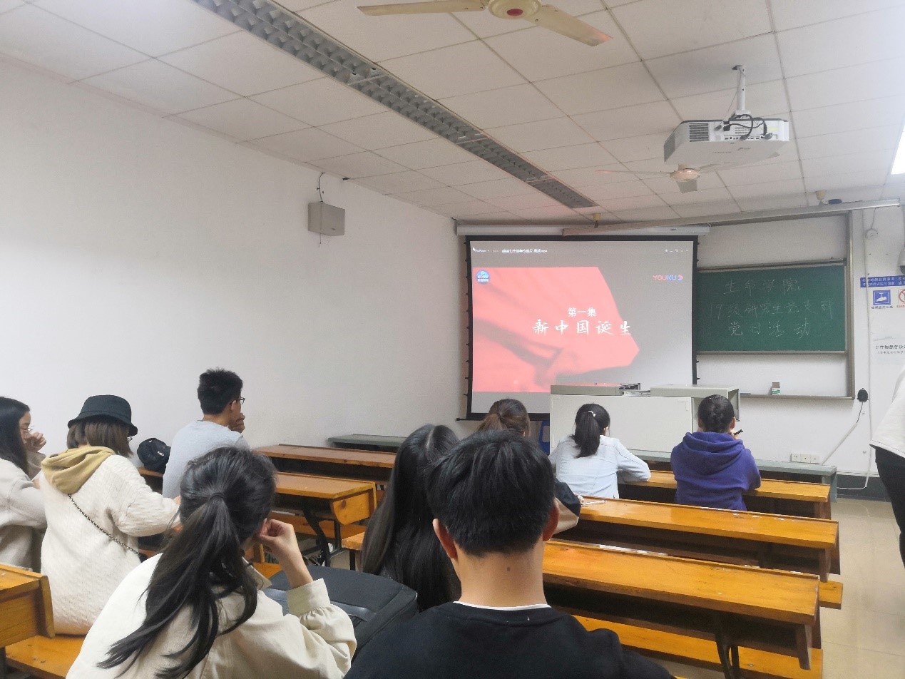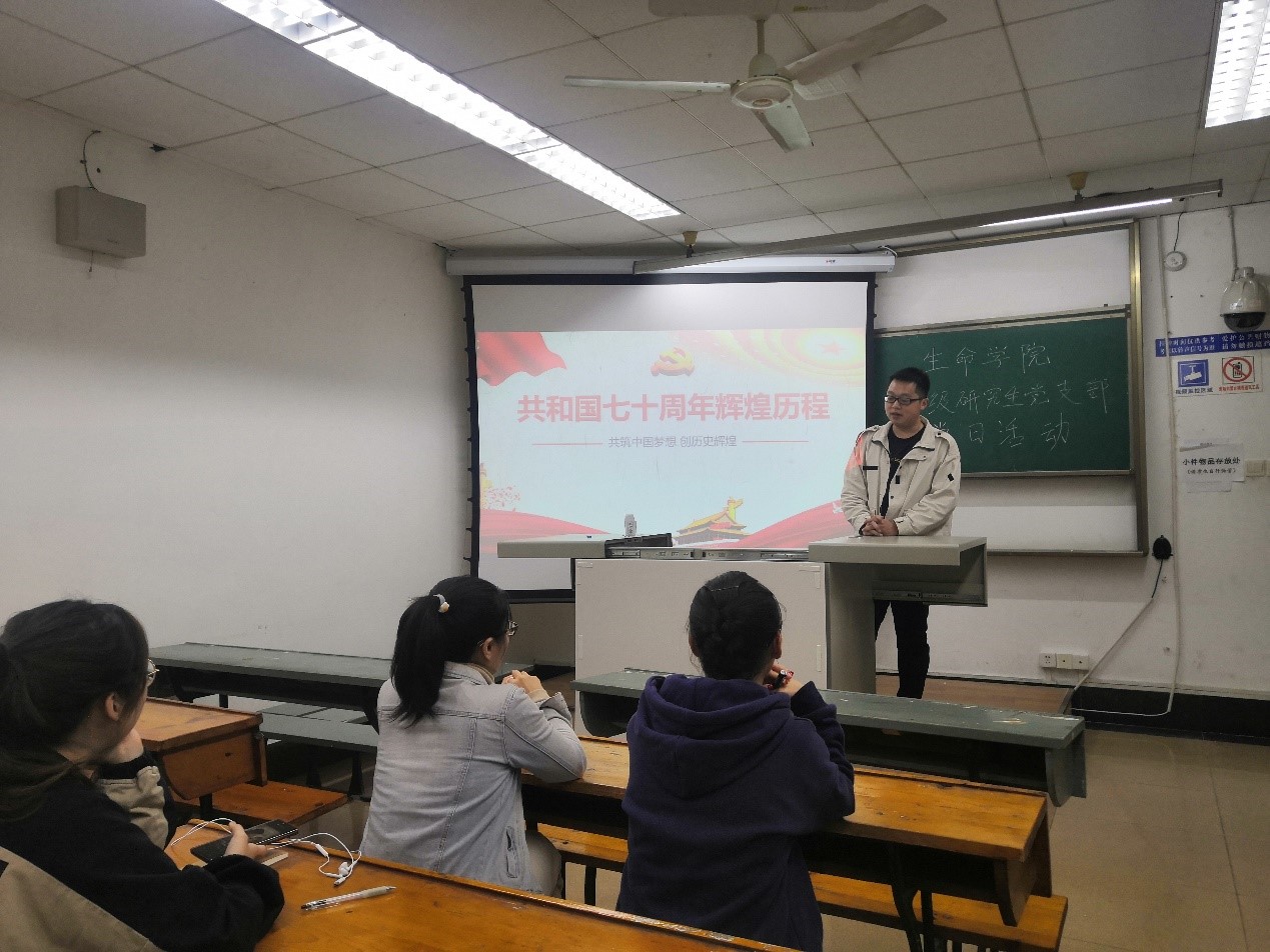 旗帜鲜红迎风飘扬,不知不觉间,这面鲜艳的五星红旗已经在共和国的上空飘扬了半个多世纪,在中华人民共和国成立70周年的今天,我们一遍遍回顾着感念着新中国成立的光辉历程,这段历史必将为每位中华儿女所铭记,这期间涌现出的光辉事迹,英雄人物,历史启示,也必将铭刻在每位中国人的心中。今天,也就是10月29日,365英国上市公司2019级研究生党支部在4304a教室展开了“回顾共和国70周年辉煌历程”的党日活动,活动由党支部书记吴京川同志主持。