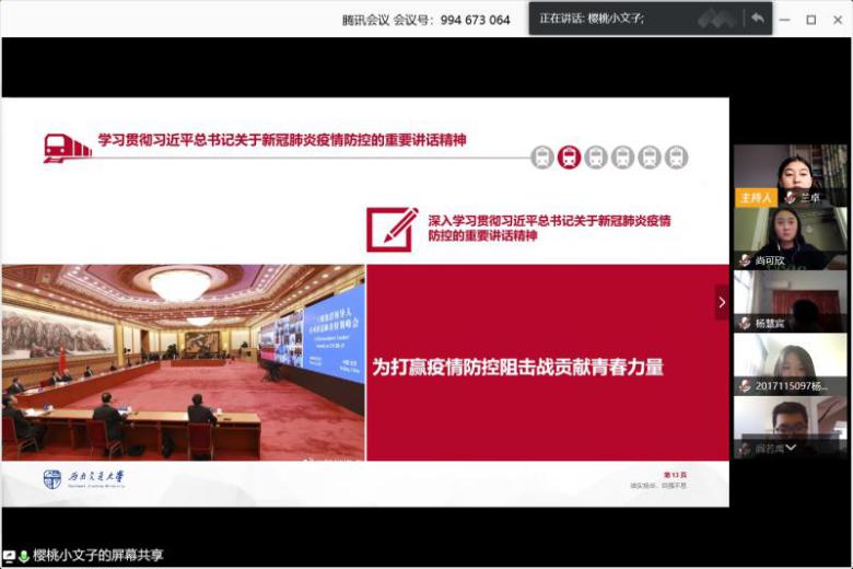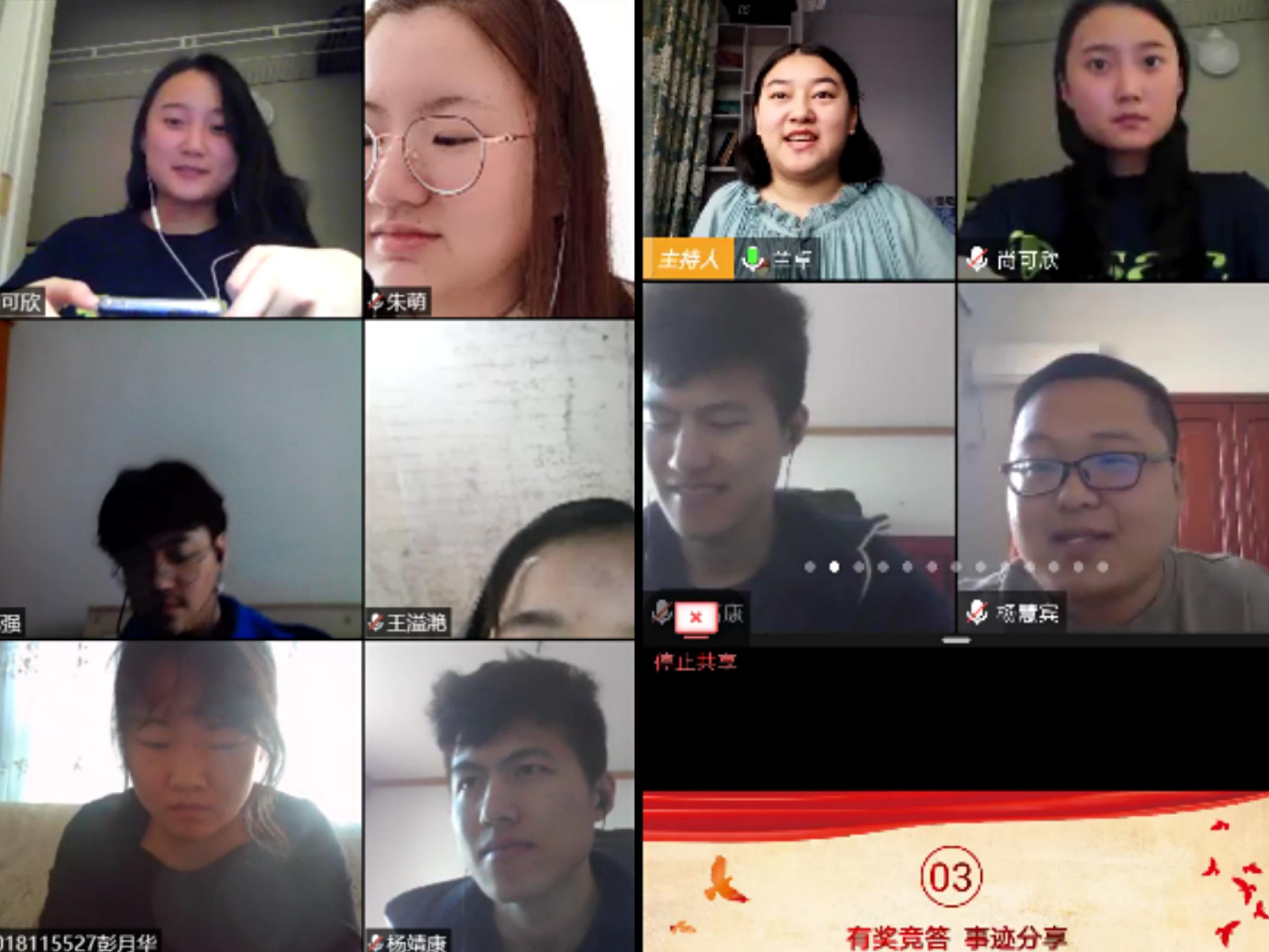 随后,在下一环节中,同学们纷纷发言,分享自己和身边人在抗“疫”期间的事迹。郝博新同志分享了身边朋友在疫情期间挺身而出,参与抗战一线工作的感动;王溢滟同志分享了自己在家乡担当志愿者的所作所为,希望为家乡的抗疫工作贡献自己的一份力量;尚可欣同志作为身处美国亚特兰大的职工,分享道:中国大使馆积极组织协调,与亚特兰大四所公司的中国员工会取得联系,为在美职工发放防疫物资,尚可欣同志深切感谢到我国对于职工的关心,并为作为一个中国人而感到自豪。不管身处何处,国家永远是我们的依靠。
