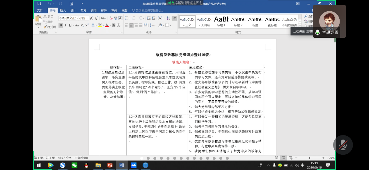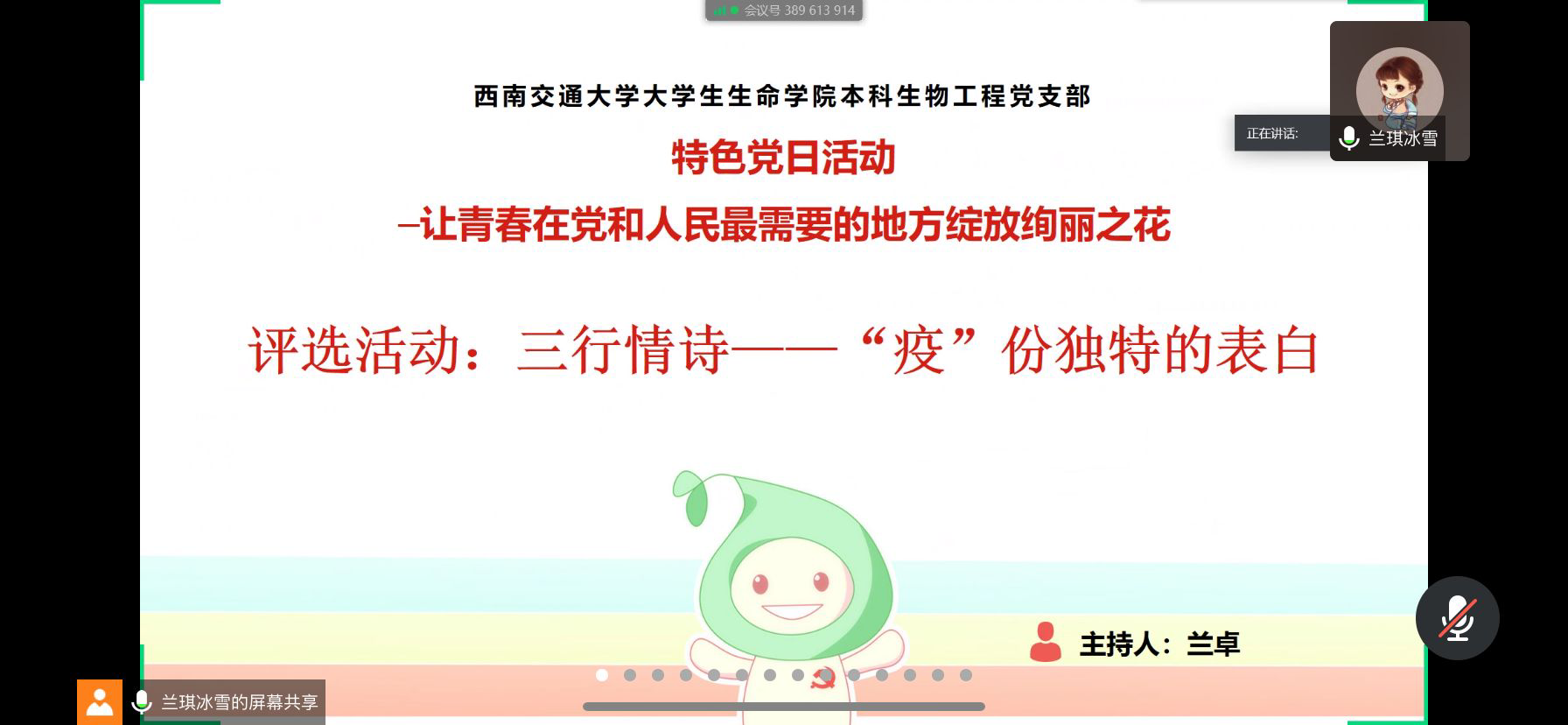 365英国上市公司本科生物工程党支部于2020年5月16日下午15时通过腾讯会议召开了以“让青春在党和人民最需要的地方绽放绚丽之花”主题的云党日活动,本次活动由党支部副书记兰卓主持,党支部全体成员参加。