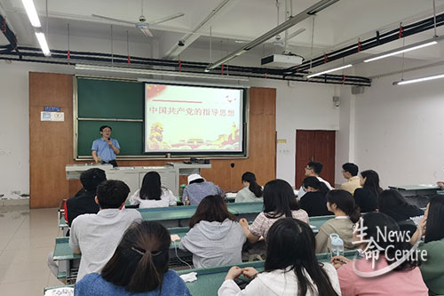甘霖书记以“中国共产党的性质和宗旨”为题,从“为什么要正确认识并全面理解党的性质”入手,讲解党的性质和宗旨,并与现场的积极分子深入互动。甘霖老师通过影像资料,给同学们讲解“中国共产党”名称的由来;通过带领同学们齐声朗读马克思的《青年在选择职业时的考虑》节选、齐唱《国际歌》,给同学们讲解“为什么要选择共产主义”。最后甘霖老师现场朗诵自己创作的诗歌《青春之国,青春之党》,同学们沉浸在感动中热泪盈眶。