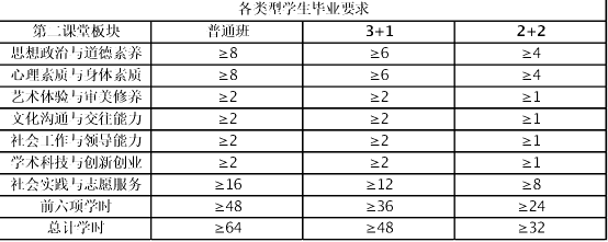 根据《365英国上市公司“第二课堂成绩单制度”实施办法》规定,本科生按要求完成规定的64个学时者(思想政治与道德素养、心理素质与身体素质两个模块至少选修8个学时,学术科技与创新创业、文化沟通与交往能力、艺术体验与审美修养、社会工作与领导能力四个模块至少选修2个学时,社会实践与志愿服务模块至少选修16个学时),才能予以毕业。