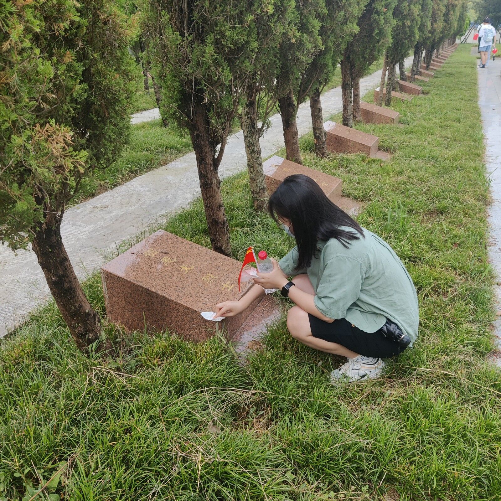 温江区烈士陵园是为纪念平叛、剿匪牺牲的革命先烈的一处爱国主义教育基地。志愿者们严格按疫情防控要求指示进入烈士陵园,首先拜读了该烈士陵园的历史沿革,大家在刻有英烈名录的碑前停下,瞻仰烈士姓名,肃静默哀以示敬意。在征求烈士陵园相关管理工作人员的同意后,志愿者们仔细地擦拭了雨后英雄墓碑上的枝叶泥点,展现出了志愿者们对英雄烈士们崇高的敬意。