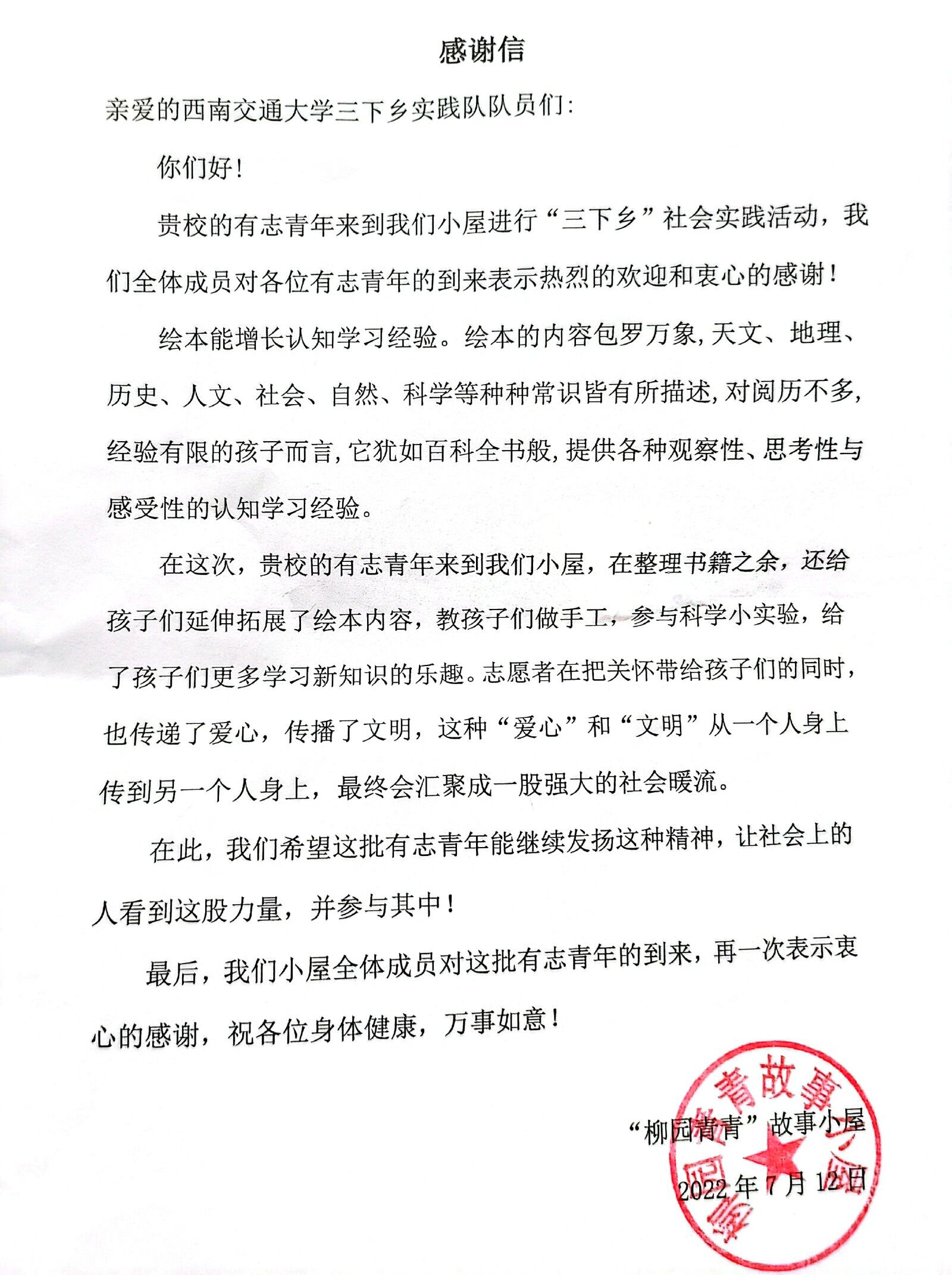 故事小屋活动感谢信