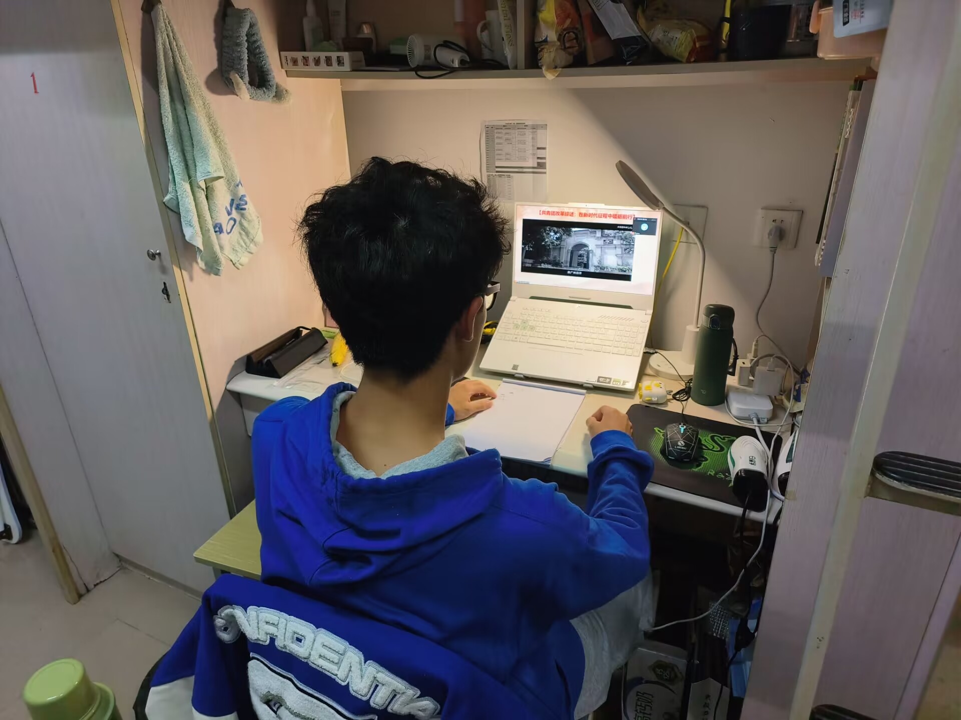 同学们在宿舍使用电脑认真听取团课内容,并做好记录。