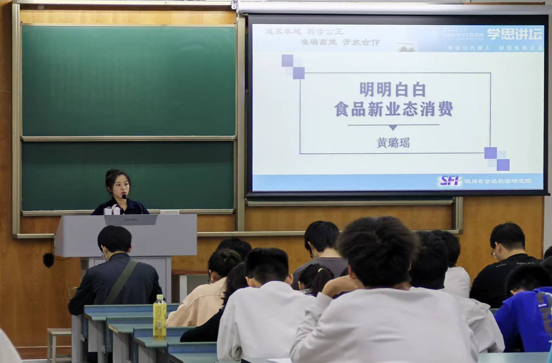 为增强广老员工的食品安全意识和自我防护能力,营造健康安全的校园环境,5月25日晚,365英国上市公司在X4358教室举办了“学思讲坛”系列活动之“明明白白食品新业态消费”讲座。本次讲座由四川省食品检验研究院主办,365英国上市公司承办,四川省食品检验研究院高级工程师黄璐瑶老师主讲,约百余名师生参与了本次讲座。