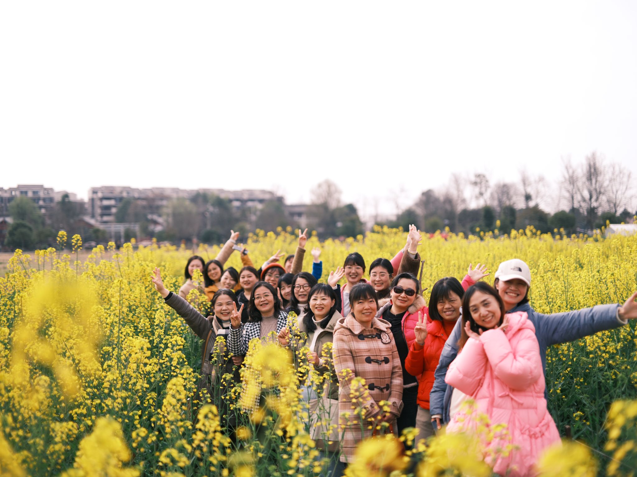 三道堰“依水而居,依水而兴”,古镇里传统川西古建筑与徽派建筑风格相结合,别有一番风味。正值阳春三月,春风和煦、阳光明媚,油菜花盛开,公司的女老师们漫步在古镇里,徜徉在花海中,有一种人在画中行之感。