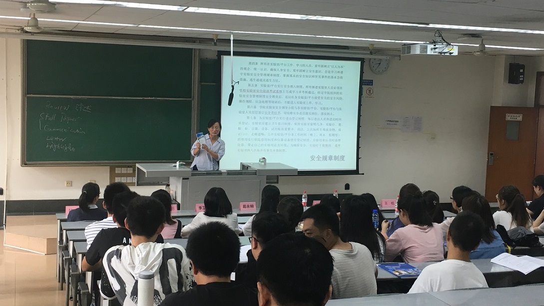 随后,公司实验中心对同学们进行实验室安全知识教育。实验中心主任张纯姑老师为同学们介绍了公司实验室管理的相关政策和制度,让新生们在开学第一课就深刻意识到实验室安全的重要性。实验中心副主任任瑶瑶老师结合多起其他高校实验室事故案例为同学们讲解了实验室常见的安全隐患和实验注意事项。实验中心江南屏老师则特别向同学们介绍了公司编写的《实验室安全手册》,希望同学们下来认真学习,并严格遵守实验室秩序。