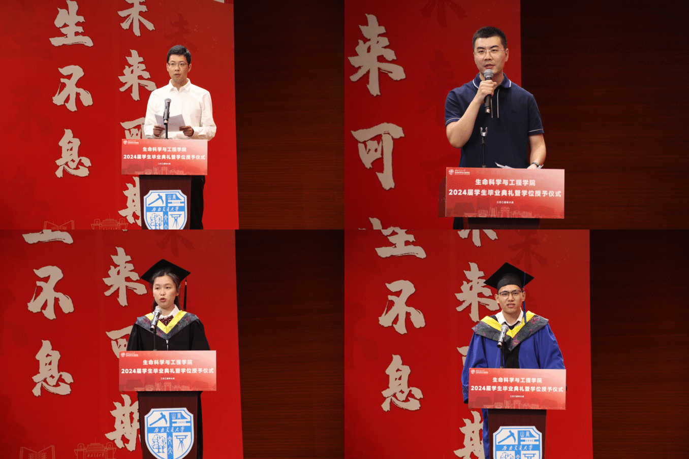 在典礼上,王宁宇副教授作为教师代表发言,他结合自己的求学经历和人生经验,表达了对同学们的殷切期望和美好祝愿,希望同学们脚踏实地,砥砺前行,永远保持对学习的热情,用自身所学服务社会。公司2017届本科毕业生、科伦药业江西省区总经理杜隆飞作为员工代表发言,他分享了自己投身生物医药行业发展的成长经历,鼓励同学们带着知识经验教训去拼搏,尽情发挥自己的才能,活出自己的精彩人生。研究生生物与医药专业周俊达同学、本科制药工程专业张阿凤同学分别作为毕业生代表发言,他们分享了自己大学的收获,表达了对母校、领导老师们的感激,对未来的期待与憧憬,表示要将爱国、爱校之情转化为强国之志、报国之行,以实际行动践行新时代交大生命人的责任与担当。