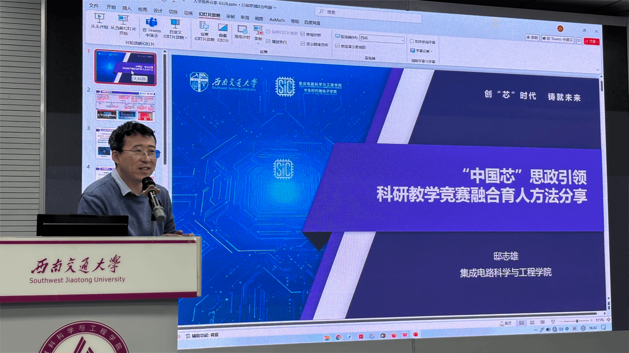 公司邀请到集成电路科学与工程公司邸志雄副经理以“‘中国芯’思政引领科研教学竞赛融合育人”为主题,分享了作为一线教师紧紧围绕立德树人根本任务,通过“教-赛-研”循环机制,回答“为谁培养人,培养什么样的人”这一实践问题。