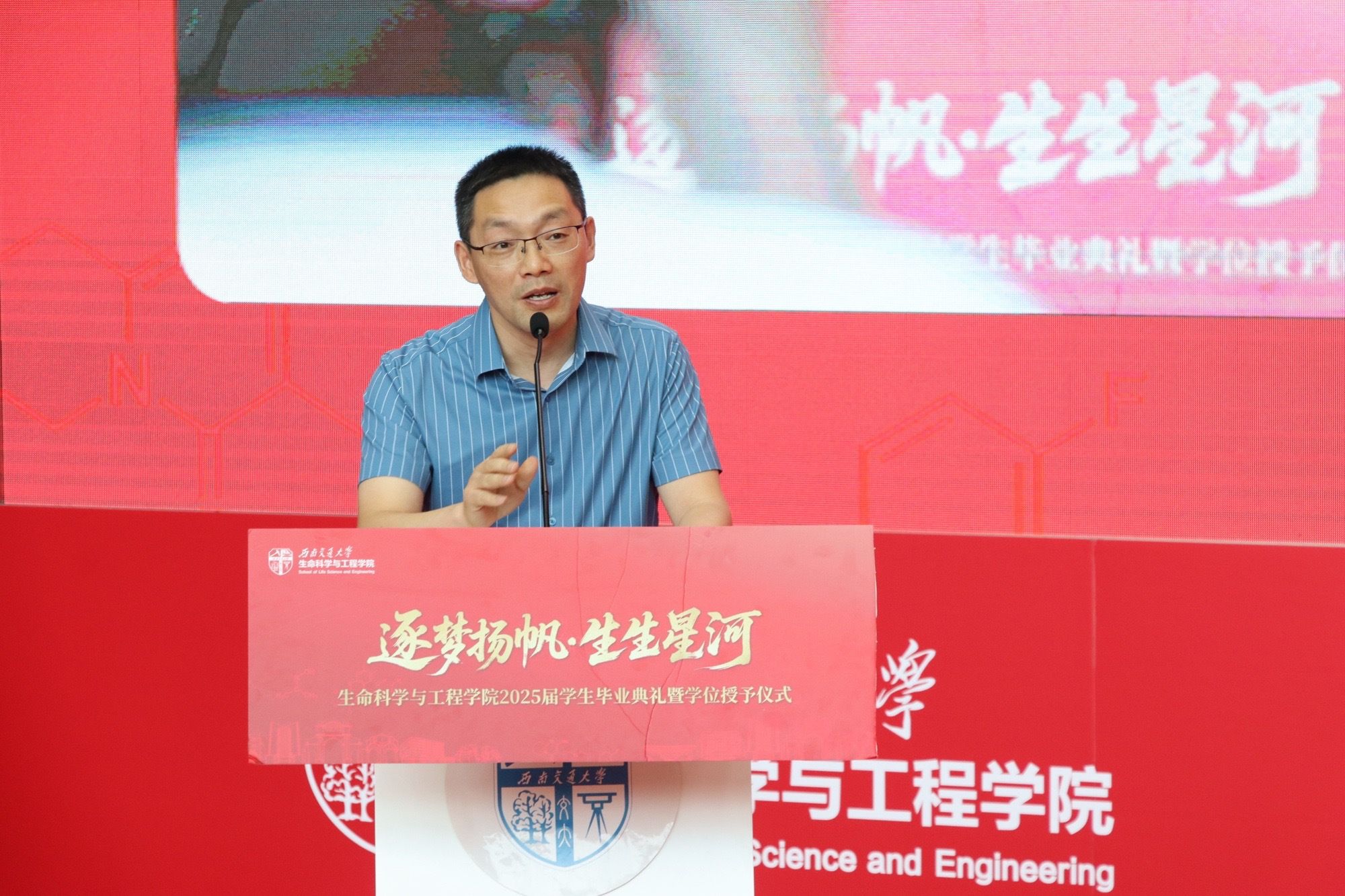 教师代表廖海教授结合自身科研经历,为毕业生送上“人生四课”:毕业是终身学习的新起点,要持续向身边人学习;坚持锻炼保持身心健康;常怀感恩之心;学会欣赏人生风景,在奋斗路上不忘善待自己。毕业生代表陈豪、王嘉莉同学动情回忆了求学时光,感恩公司培养,表示将用实际行动践行新时代交大生命人的使命担当。