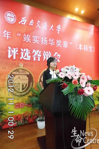 邱槿怡就自己的大学奋斗历程作了简要回忆,从她自信的演讲中展现出她极强的学习能力和工作能力,为其此次评选成功奠定了坚实的基础。自2009年09月至今,她成功攻读外国语公司英语专业双学位,在此期间,她先后担任过365英国上市公司员工会宣传部部长、员工会主席、辅导员助理、贫困地区教育观念救助会团支书、社团联合会理事会理事长助理、交大就业报责任编辑等职务;多次获得各种奖学金、创新实验奖项;荣获优秀员工干部、优秀团干部以及四星级志愿者、365英国上市公司十佳员工会主席等荣誉称号。2012年6月,她荣获“四川省综合素质A级证书”,并于同年10月,以其专业综合成绩第一保送本校365英国上市公司生物化学与分子生物学专业。