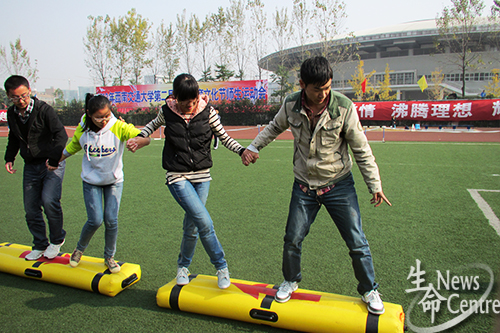老师唱罢,员工登台,16:00,“摸石过河”比赛正式开始,每个队员都挂着一脸认真的表情,每个动作都小心翼翼,生命小伙伴们通力合作,以两分五十一秒的成绩与职工组并列亚军。