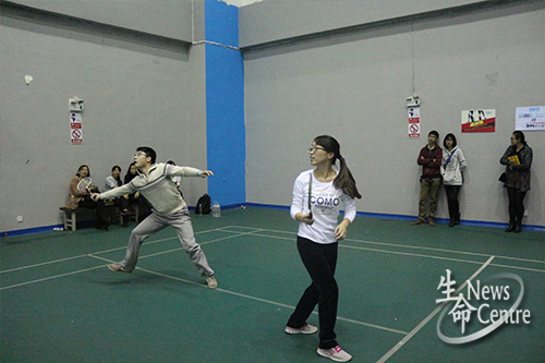 首先进行的是男子双打。由公司孟涛老师和魏源成老师对战子弟小学马群老师和陈兴明老师两员大将。看着羽毛球的发出,在空中划出一道漂亮的抛物线,第一场比赛战鼓就此打响。在对方的猛烈攻击下,比分渐渐拉开,而孟涛、魏源成两位老师步伐愈发矫健。最后公司老师不敌对方的猛烈进攻,首场告败。而之后由魏桂花老师和孔琳老师应战子弟小学周平昭老师和胥冰雯老师。