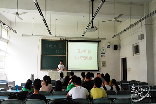 会议开始,团支书黄国强提出何为“四进四信”,但问倒了所有同学,让同学们了解到召开此次会议的重要性。接着黄国强便对“四进四信”的具体内容和深刻涵义进行了阐述解释。随后同学提出自己的看法和问题并进行了探讨交流。最后团支书对本次会议进行总结发言。