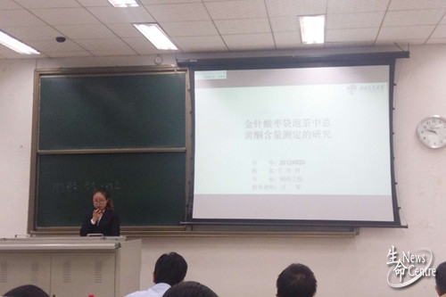 随后,每位选手上台开始毕业设计展示,在论文汇报过程中,选手们对自己的实验研究过程进行了概述,并展示了研究成果。这些研究成果包括《紫草植物DNA条形码的鉴定与研究》、《贝母类药材成分指纹比较》及《金针酸枣袋泡茶中总黄酮含量测定研究》等,其中邱萍萍同学结合三张CAD打印图纸向大家汇报了其生物工程车间工艺设计类毕业设计,学科特色鲜明。紧接着,评委老师给出指导意见,并多次强调毕设论文细节问题。
