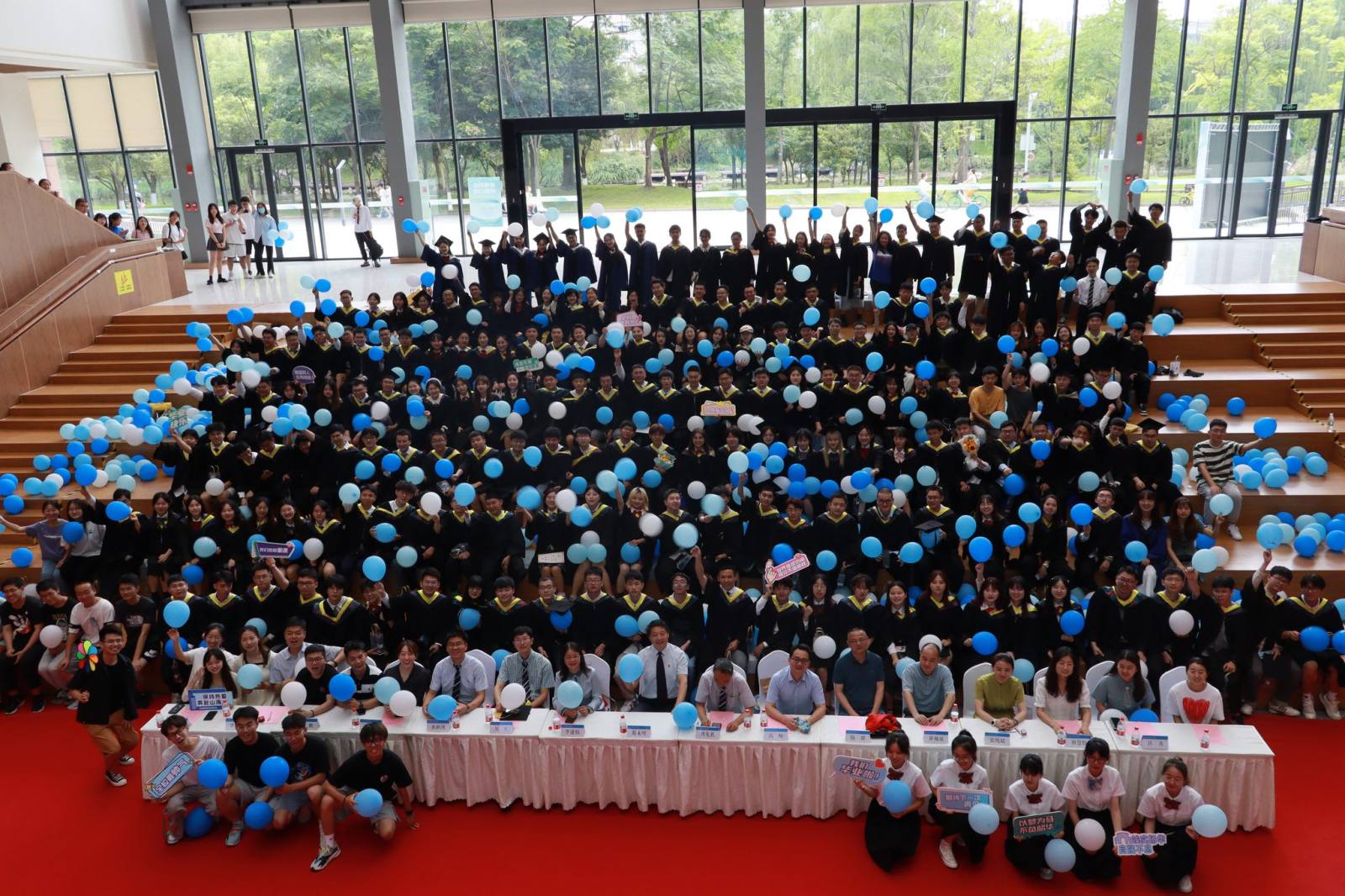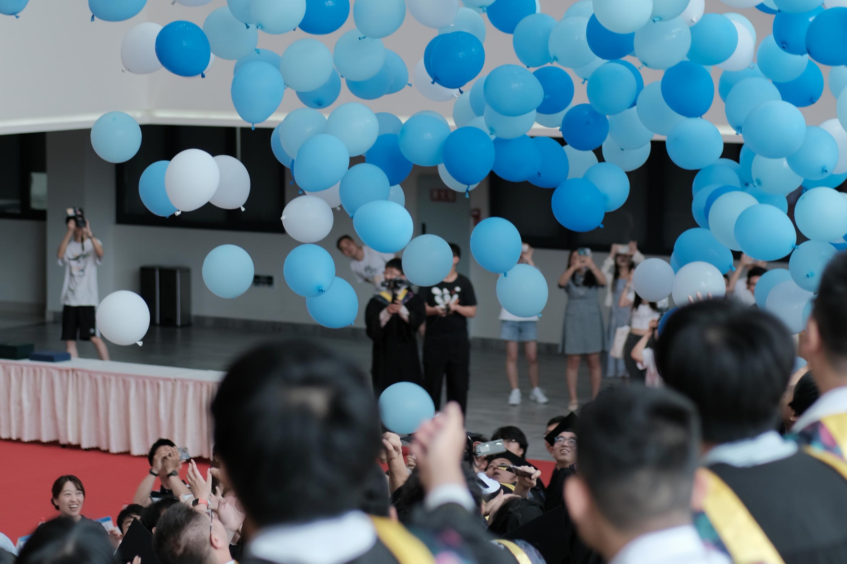 仪式尾声,辅导员胡慧怡和毕业生代表精心准备了歌曲快闪。《入海》、《记念》、《如愿》、《有我》等歌曲寄托了老师和同学们的美好期望和祝福,现场气氛欢快热烈。快闪环节的最后,全体毕业生齐唱《不说再见》,既向过往的校园生活说再见,又饱含对同学情谊、师生情谊、员工情谊的铭记与珍藏。随着一声“毕业快乐”,几百个气球从天而落,将典礼推向高潮,授位典礼圆满结束。