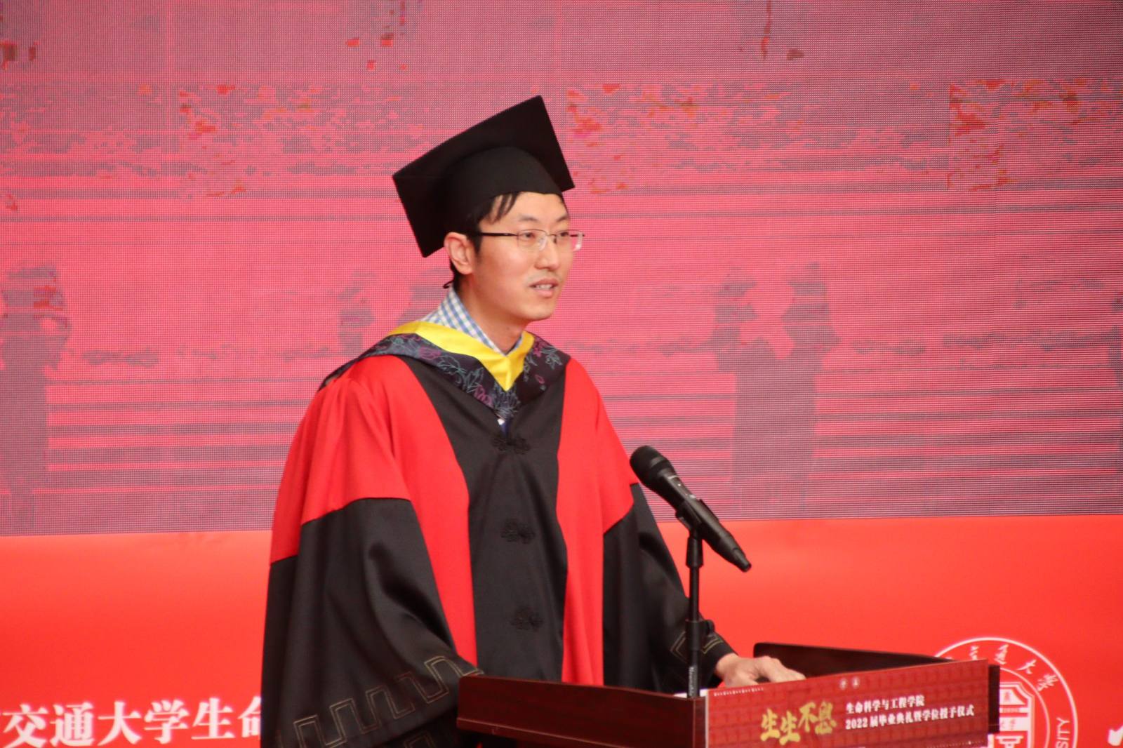 教师代表、药学系主任万军发言。他以幽默的口吻带同学们回顾了在公司的成长历程,分享了作为教师教书育人的自豪感和幸福感,希望同学们“走”得再远,“飞”得再高,也不要忘记常回交大看看,公司永远是同学们最坚强的后盾。