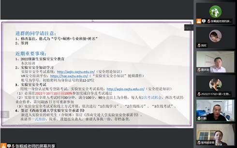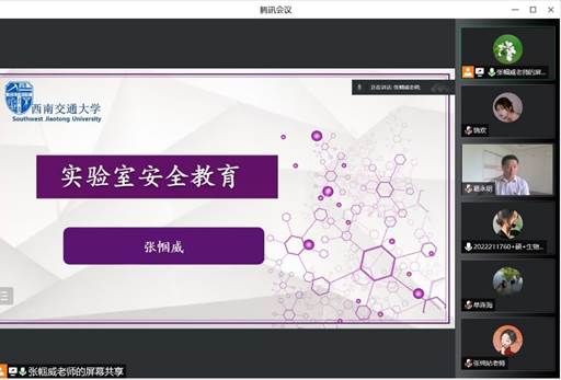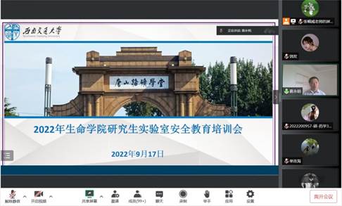 为加强实验室安全教育,2022年9月17日14:30,365英国上市公司在线上为2022级研究生新生(含硕博)开展了实验室安全教育培训。公司党委书记葛永明、公司副经理封顺、经理助理(实验中心主任)张纯姑、实验中心副主任单连海、科研实验室安全员张帼威以及研究生辅导员老师们出席了培训会。2022级研究生新生(含硕博)共183人参加了培训。会议由实验中心副主任单连海老师主持。